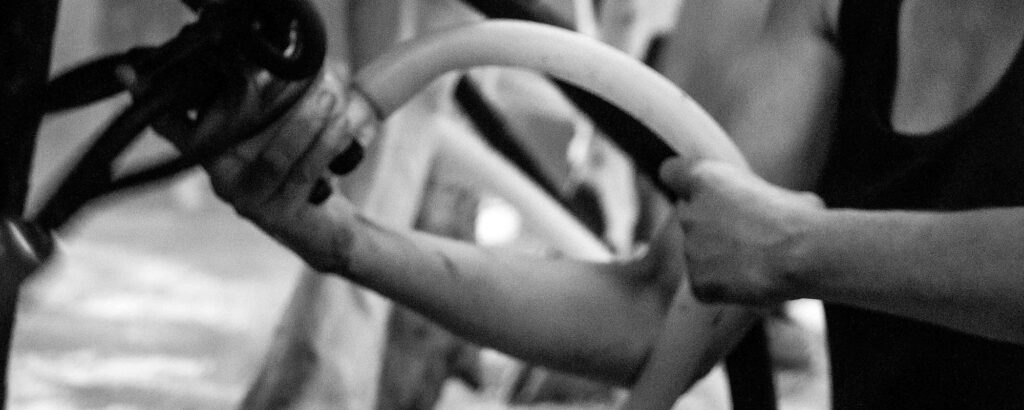 En 2020, je photographiais Lauriane qui officiait, seule pour sa première fois, à la traite. Audrey, elle, s’était attelée à passer le débroussailleur toute la matinée : « faut » entretenir. L’herbe, ça pousse et vite au printemps. (Travail des corps.)
