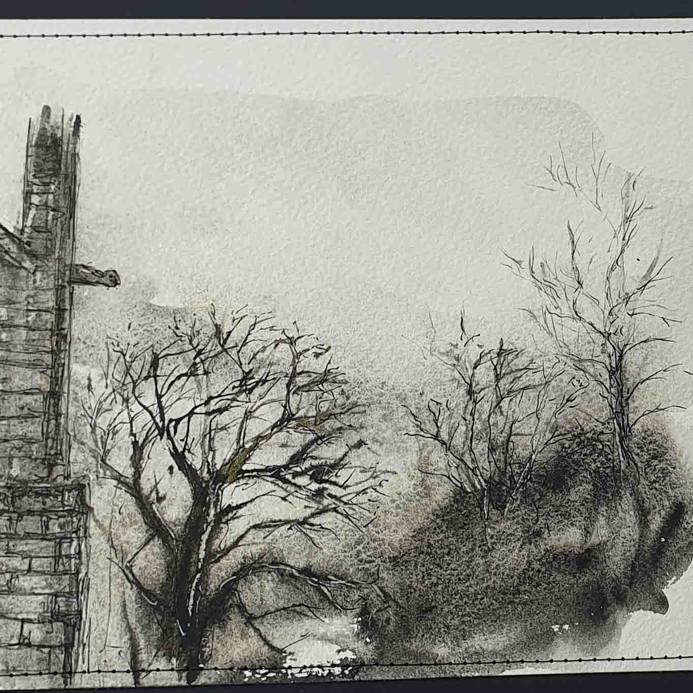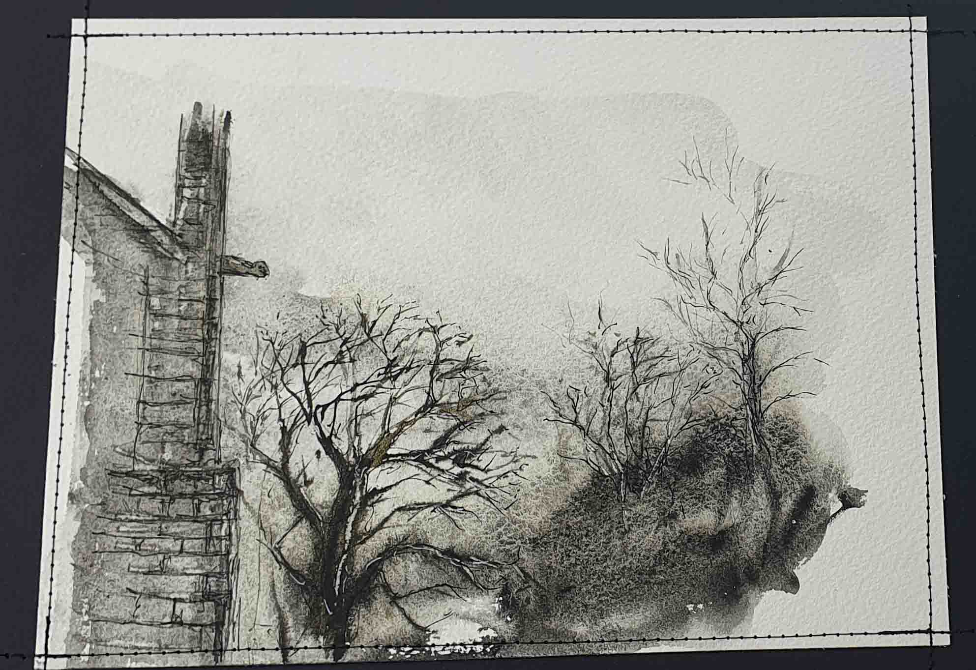 Cette aquarelle Saint Fiacre fait partie d’une série entamée en 2023, avec une image destinée à être intégrée dans mon ouvrage Paysômes. Comme je voulais suggérer mon grand-père, je me suis (tadam ou tilt ^^) : eh bien, peignons en noir… puisque le livre sera imprimé en noir et blanc.